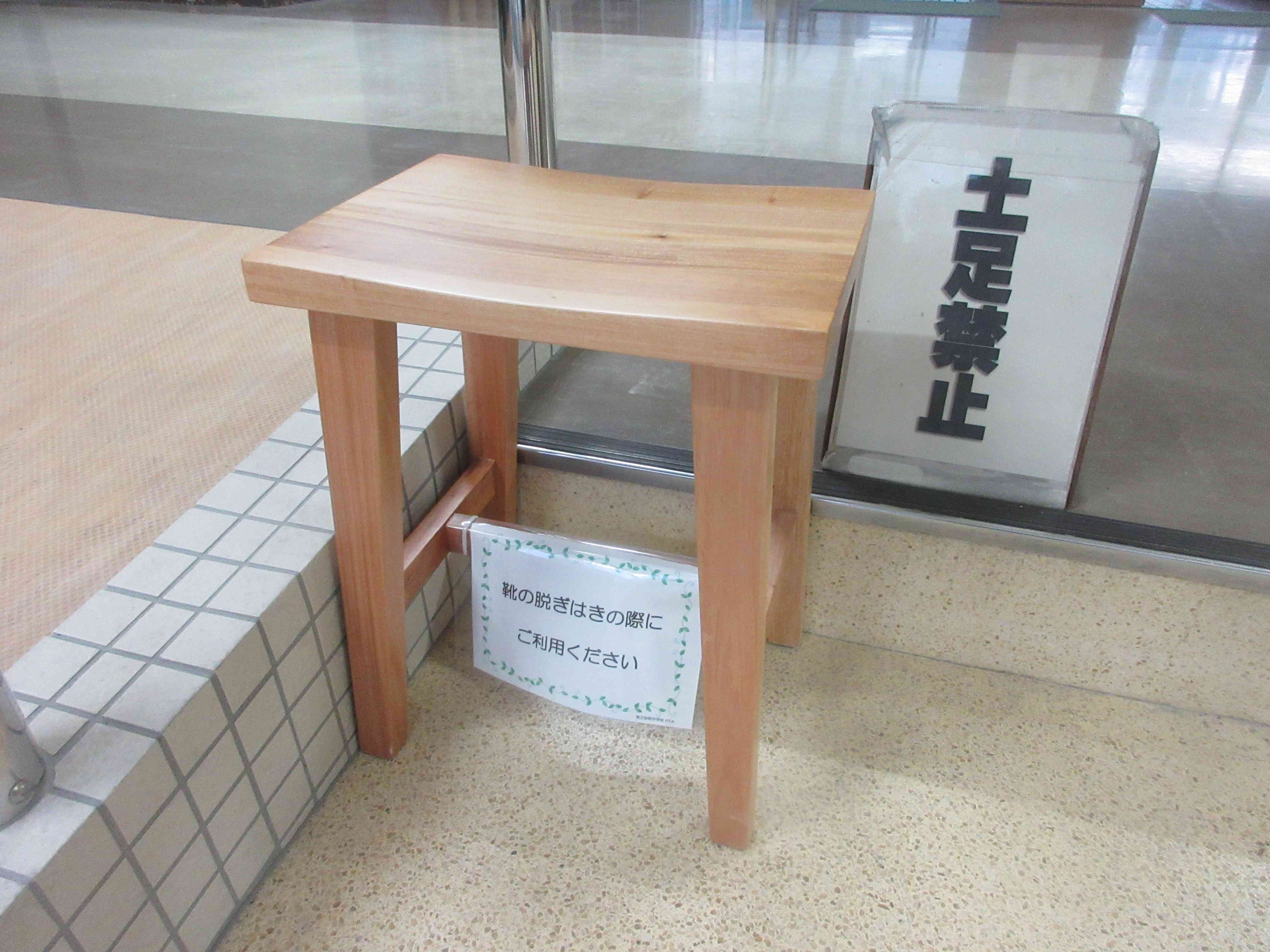先週、本校の昇降口に設置する椅子をPTAより寄贈しました。 入口のスロープ設置など、バリアフリー化の進む三砂中ですが、まだまだ段差などもあり、地域の方々やケガをした生徒が靴を履き替える際に活用していただければと思っています。 今後も保護者と教職員がアイデアを出し合い、よりよい三砂中を作っていけるよう協力していきたいと思います。 皆さまご協力よろしくお願いいたします!